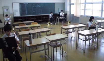 吹奏楽部は、距離を保って練習しています。