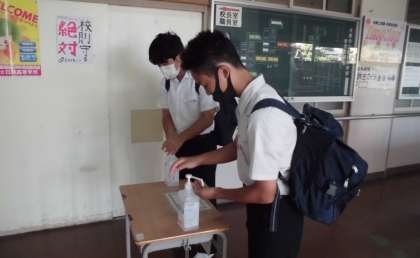 登校したら、手指の消毒をします。