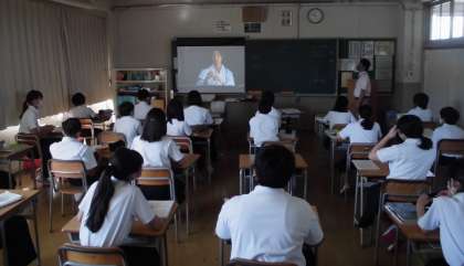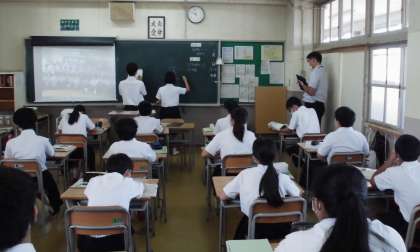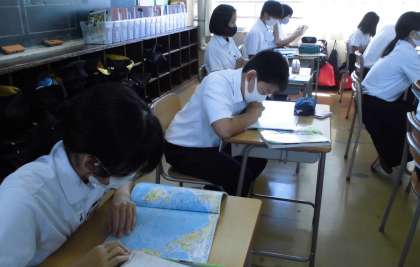理科の授業ではアンモニアと水素の性質を考え、社会の授業ではマーシャル諸島を地図で探しています。