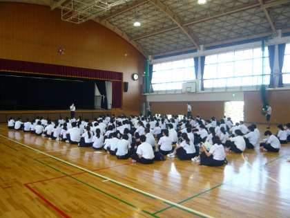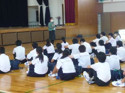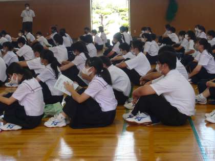 4限、2年生は体育館で、月曜日から行く林間学舎の前日注意を行いました。