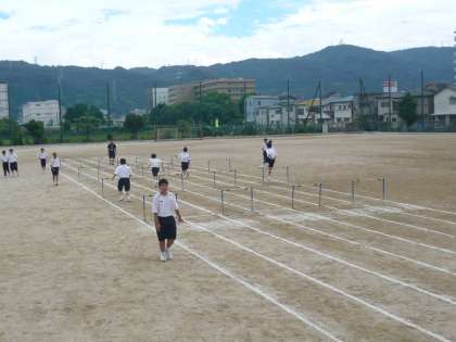 4限、1年3・4組の男子は、グラウンドでハードル走の授業をしていました。