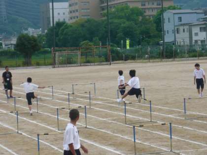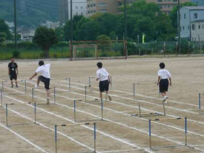ハードルを越すときに、フワッと浮いてしまうと速く走れません。なるべくハードルから離れた位置から跳ぶのがコツです。