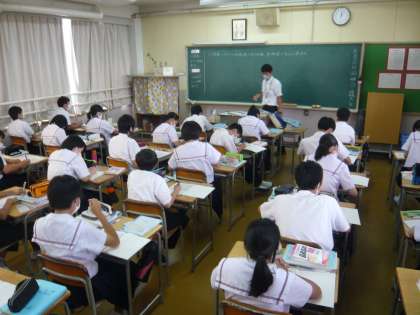 4限、2年1組は理科で化学変化の学習、2年2組は数学で一次関数のグラフの学習をしていました。一生懸命問題を解いています。
