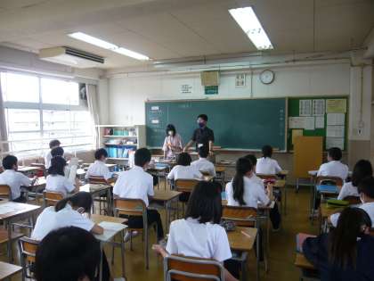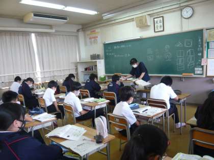 3限、1年1組は数学、今日はTTで方程式の学習に入っていきます。1年2組は家庭、繊維の種類と手入れについて学習しています。