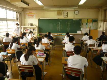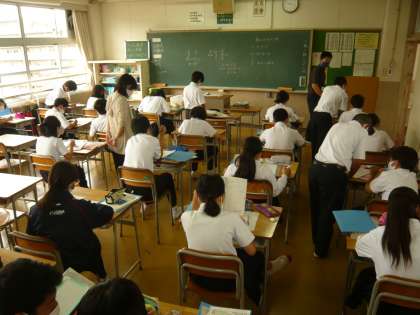 1限、1年1組は数学で方程式の学習です。今日はTTです。1年2組は国語で、プリントを使って学習していました。