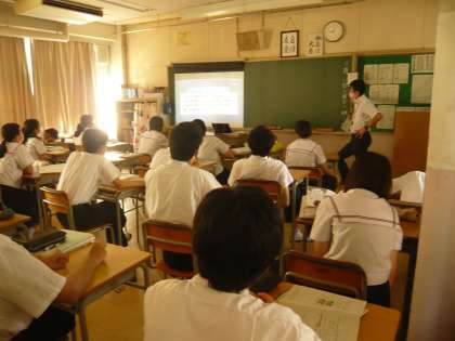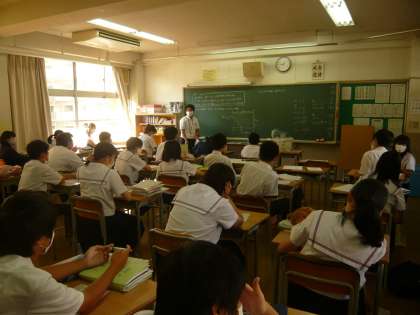 1限、3年3組は理科で、作用・反作用について映像を見て学習していました。3年4組は数学で、図形の学習かな?難しそうなことを習っていました。