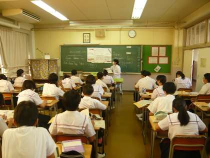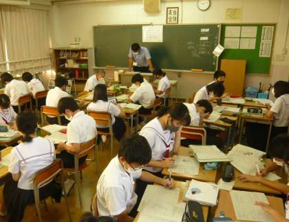 1限、2年1組は社会で、地理の確認テストの答え合わせ中でした。2年2組は理科で、節足動物についての問題について答え、説明を聞いているところでした。先生手作りの資料が今日も活躍しています。