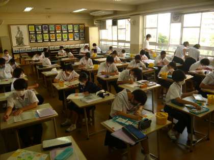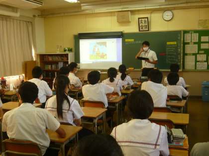 1限、2年3組は英語です。映像資料を見て内容について理解しようという授業です。2年4組は美術、各自ポスターの制作に取り組んでいます。