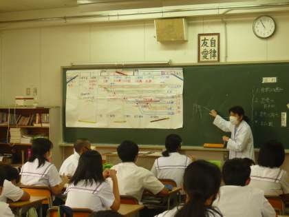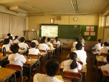 3限、2年1組は理科、いつものように先生の手作り資料が活躍しています。2年2組も理科、こちらは映像資料を見て学習です。