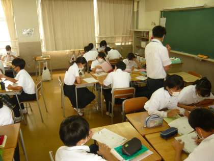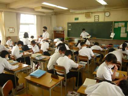 3限、1年3組は数学で、方程式の問題を次々に解いていました。1年4組は国語で、班ごとに教え合いながら白プリントに取り組んでいました。