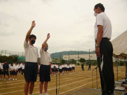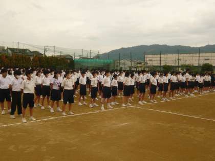 午後から体育大会予行を行いました。終了間際に雨が降ってきて、閉会式の予行練習はできませんでしたが、ほぼ予定通りに行うことができました。予行の様子を紹介します。開会式です。