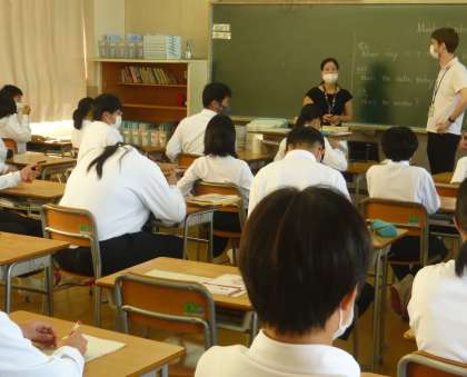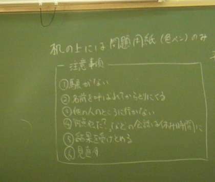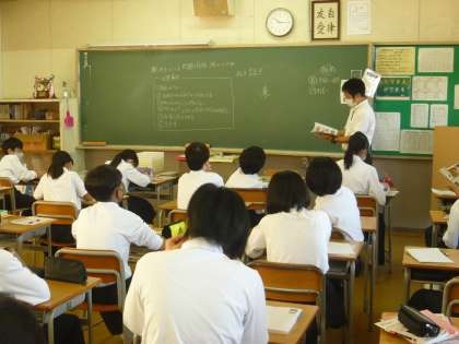 2限、1年3組は英語、1年4組は歴史の授業です。英語は、テスト返しが終わって今日の学習に入るところでした。歴史は、黒板にテスト返しのときのルールが書かれていました。