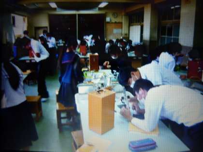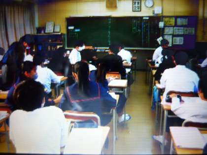 3限、2年3組は理科(第2分野)、理科室で顕微鏡を使っています。2年4組は国語、平家物語です。