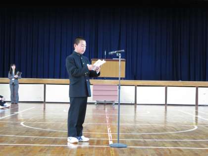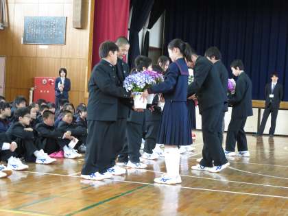 新入生の言葉(辻本くん)、在校生の言葉(生徒会長・土本くん)の後、最後は生徒会役員から1年生に花の贈呈がありました。