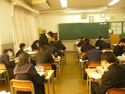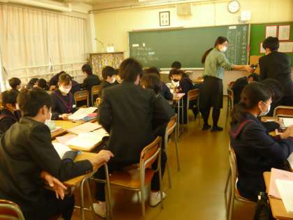 6限、2年1組は数学、問題を解いています。教え合いもありです。2年2組は国語、「三人の人物像を読み取る」という学習活動を班で行っています。