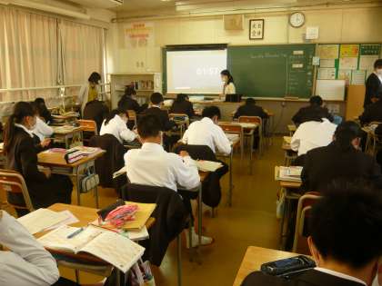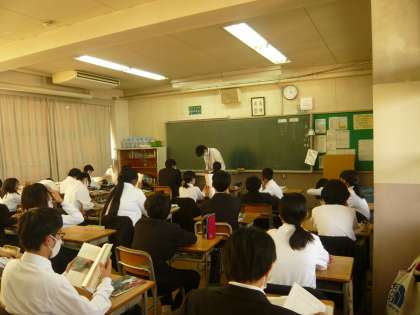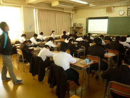 6限、1年2組は英語、ワークを仕上げていました。1年3組は国語、これからCD(朗読?)を聞くようです。1年4組は理科、光と音の速さについて学んでます。