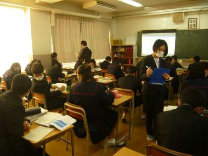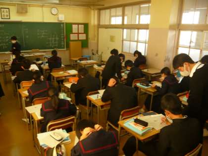 4限、2年1組は理科、オームの法則を使って学習していました。2年2組は数学、プリントの問題に取り組んでいます。