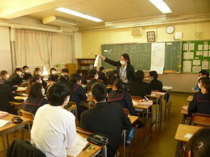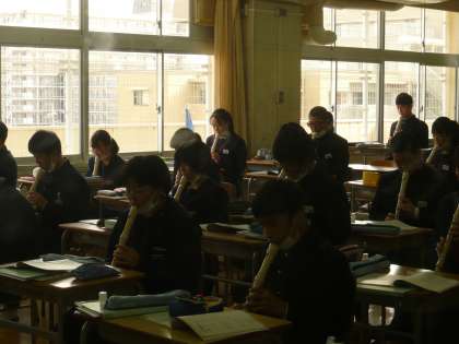 4限、2年3組は国語、人物像の読み取りを班ごとにまとめたものを見ています。2年4組は音楽、アルトリコーダーの練習です。
