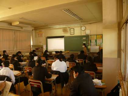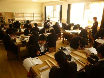 1年1組は、木工室で本立て、ラックの製作中です。1年2組は英語、世界の朝食について知るというめあてですが、ちょうど映像の視聴が終わったところでした。