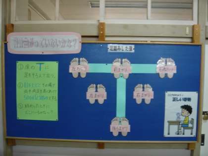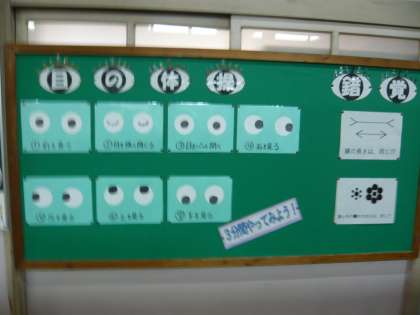 「参加型」の掲示物です。目の体操、背骨チェック、試してみて「なるほど」と思います。