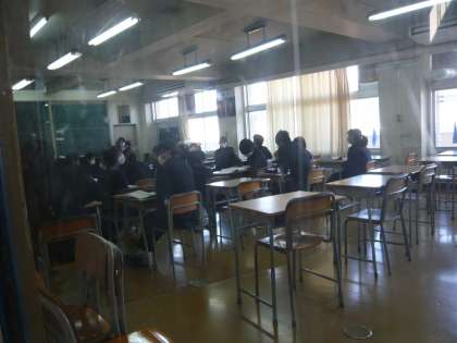 5限、3年1組は公民、期末テストの提出物について説明を受けています。3年2組は音楽、これから歌の練習?