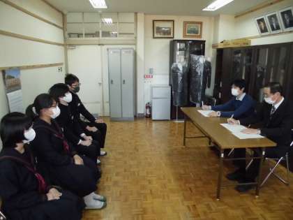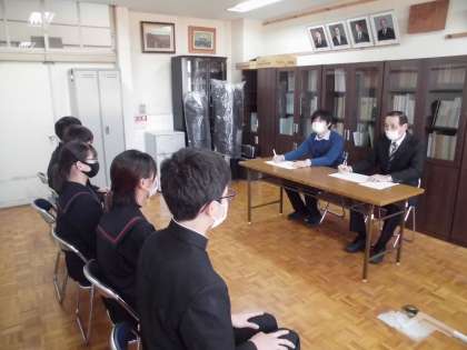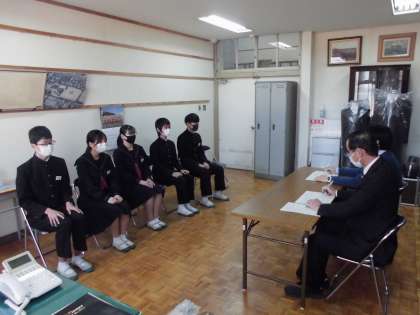 2限、3年2組の校長面接を行いました。45分授業なので本当に各グループ短時間の面接となりましたが、3年生の進路に向かう姿勢がうかがえました。
