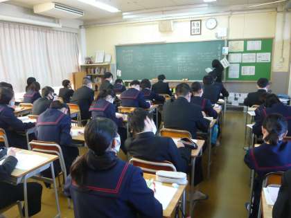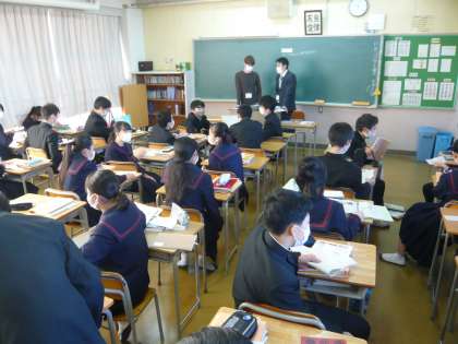 2限、2年3組は英語、スピーチテストに向けてペアで練習しています。2年4組は理科第1分野、実習生の先生が電力についての授業をしていました。