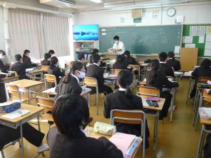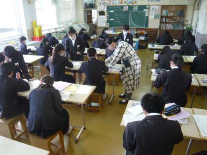 2限、1年1組は歴史の授業、期末テストの範囲の復習プリントをしています。1年2組は美術、オリジナルの案内表示を考えて描いています。実際に有効活用できるのではという作品もあります。