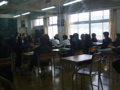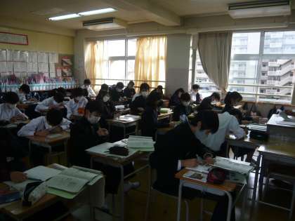 5限、2年1組は音楽、先生の話をしっかりと顔をあげて聞いています。2年2組は社会、いつものように先生の出す質問に各自答えていました。