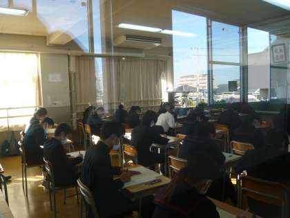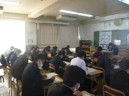 期末テスト1日目の様子を紹介します。廊下から写した写真は、少し見えにくいですがご了承ください。1限の3年1組、2組です。
