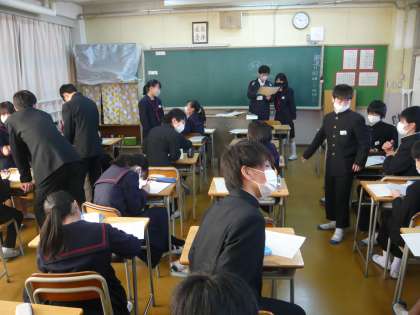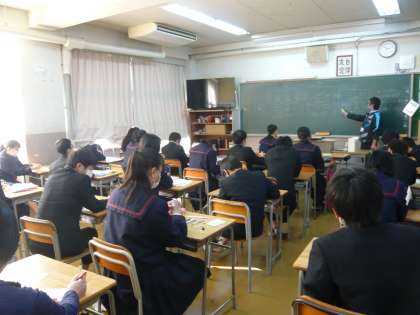 2限、2年1組は理科、テスト返しの後、問題の解説を聞いています。2年2組は数学、こちらもテスト返しです。