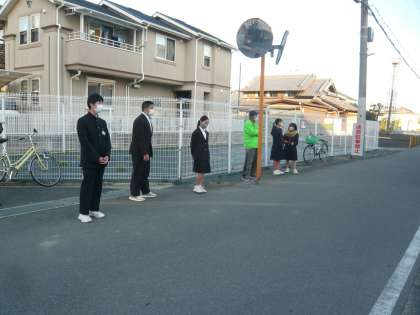 今日も生徒会役員たちが「おはようございます」と、地域の方々とともに登校する生徒たちや道行く人たちにあいさつをしています。