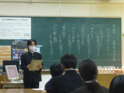 放課後、図書委員会主催で図書室で第3回ビブリオバトルを開催しました。ビブリオバトルとは、「バトラー」と呼ばれる出場者が自分が面白い、みんなにすすめたいと思った本を持ち寄り、その魅力を紹介します。そして、聞いている人がいかにその本を読みたくなるかを競うものです。