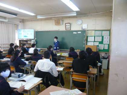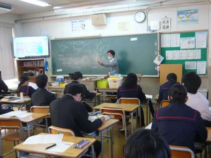 3限、3年1組は数学の授業、相似比と体積比について学習していました。何となく、先生が楽しそうです。3年2組は理科の授業、呼吸について勉強していました。