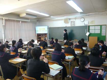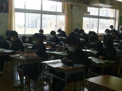 3限、2年1組は社会、歴史の授業で江戸時代の政治について学習していました。2年2組は音楽、鑑賞の時間です。
