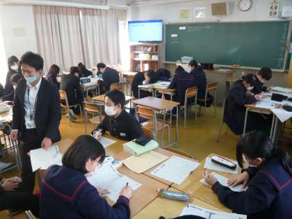 2限、3年3組は理科、水質調査の学習です。以前、先生はザリガニを30匹飼っていて、日に日に水が汚れていく様子を話されていました。3年4組は数学、「100問プリント」に取り組んでいました。生徒たちは1時間でできないかもしれないと言っていました。すごい学習量です。