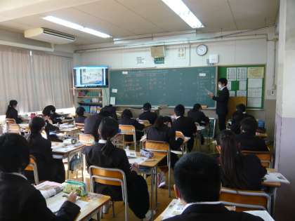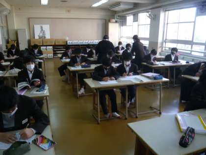 2限、1年1組は歴史、室町時代の産業について学習しています。1年2組は美術、作品作りに取り組んでいます。
