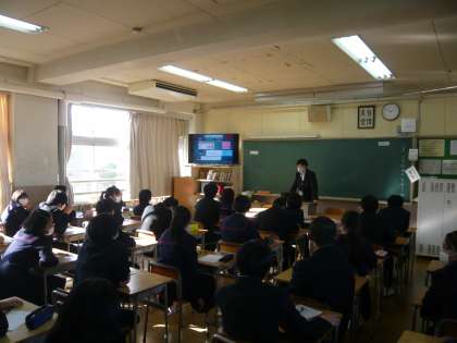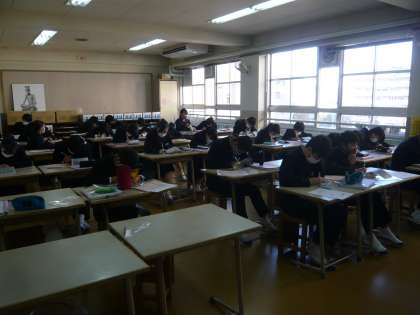 2限、2年3組は美術、点描画です。みんなとても上手です。芸能人の顔など、リアルに仕上がっていきそうです。2年4組は、授業と振り替えて総合の時間、進路学習です。高校入試の制度について学習しています。