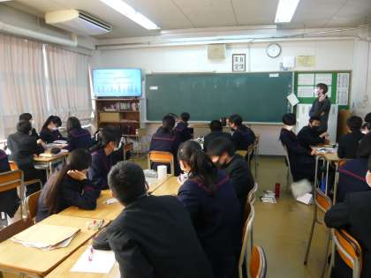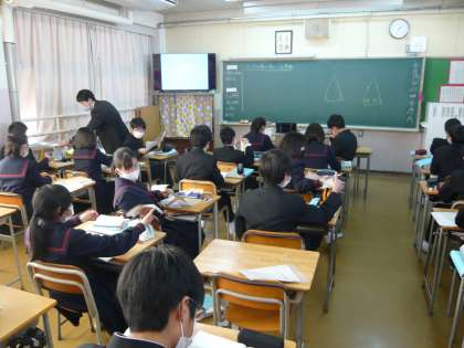 5限、2年1組は英語、デイビッド先生によるクリスマスの授業です。2年2組は数学、「2つの角が等しい三角形」の学習をしています。