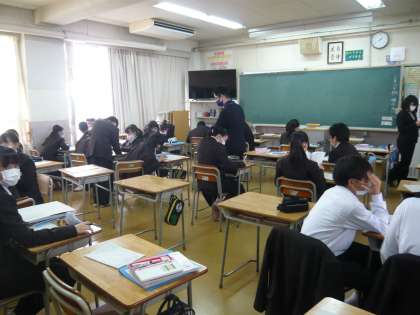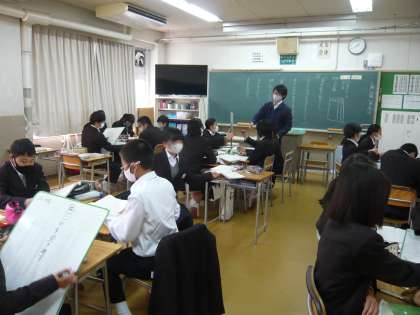 5限、1年1組は国語、班ごとに出された課題をホワイトボードに書いています。1年2組は数学、教え合いも取り入れて問題を解いています。