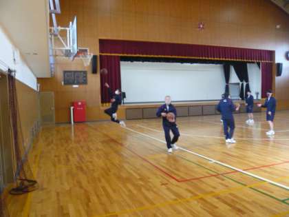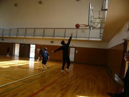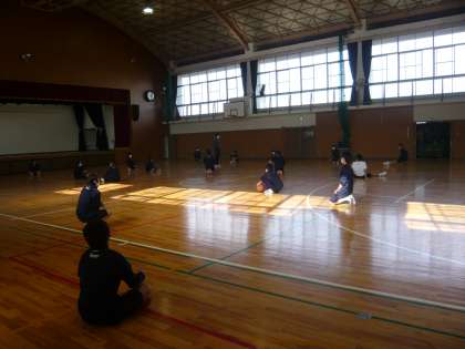 3限、3年1・2組の男子体育は、体育館でバスケットボールです。シュート練習をしています。