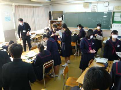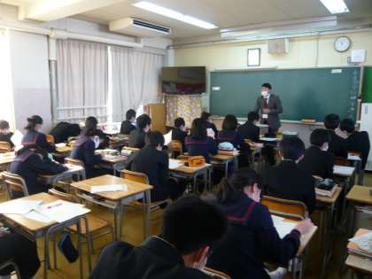3限、2年1組は社会、自分で作った問題をお互いに出し合っています。2年2組は英語、チャレンジテスト対策の授業です。