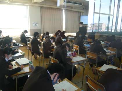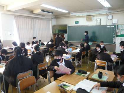 3限、1年3組は国語、班ごとに漢文を訳しています。1年4組は数学、チャレンジテスト対策のプリントに取り組んでいました。