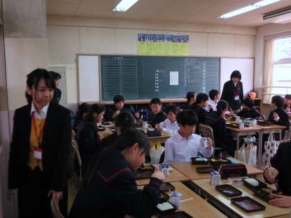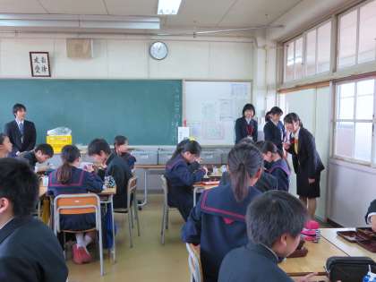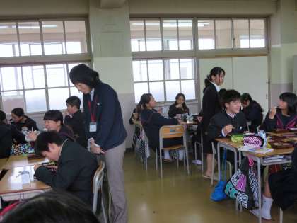 配膳員さんとの打ち合わせの後、各教室をまわって生徒に話しかけるなどしながら給食の様子をご覧になりました。