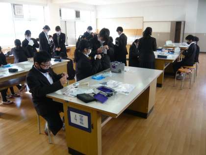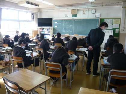 3限、1年1組は数学、TTでチャレンジテスト対策の授業を受けています。1年2組は家庭、被服室で手作りマスクに取り組んでいます。