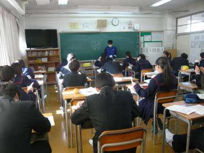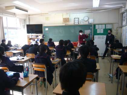 4限、3年3組は英語、今日は一斉授業です。これから毎時間、単語の100問テストを行うとのことです。3年4組は理科、電流・電圧・抵抗の学習のようです。