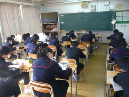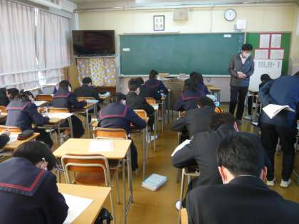 4限、2年1組は理科、宿題テストを行っています。2年2組は数学、数学も静かに課題プリントに取り組んでいました。