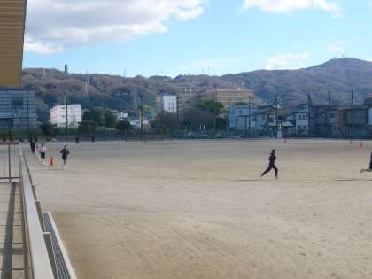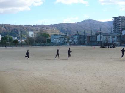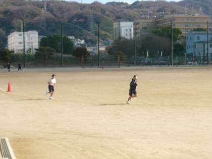 4限、1年3・4組の女子体育は、グラウンドで持久走です。寒い中、がんばっています。