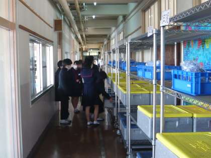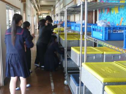 給食当番が、配膳室に配膳員さんが用意してくださった給食を取りに来ました。