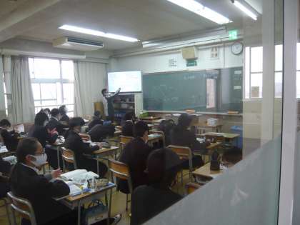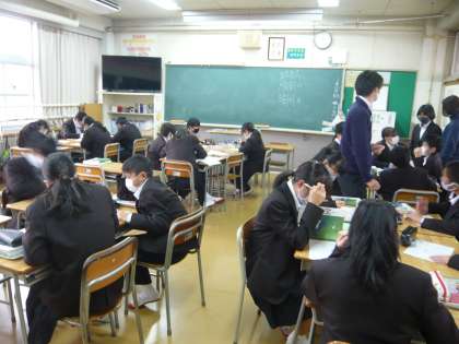 5限、1年1組は理科、火山に関連した内容を学習しています。1年2組は国語、班でプリントの問題に取り組んでいました。